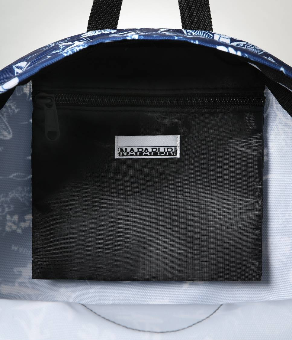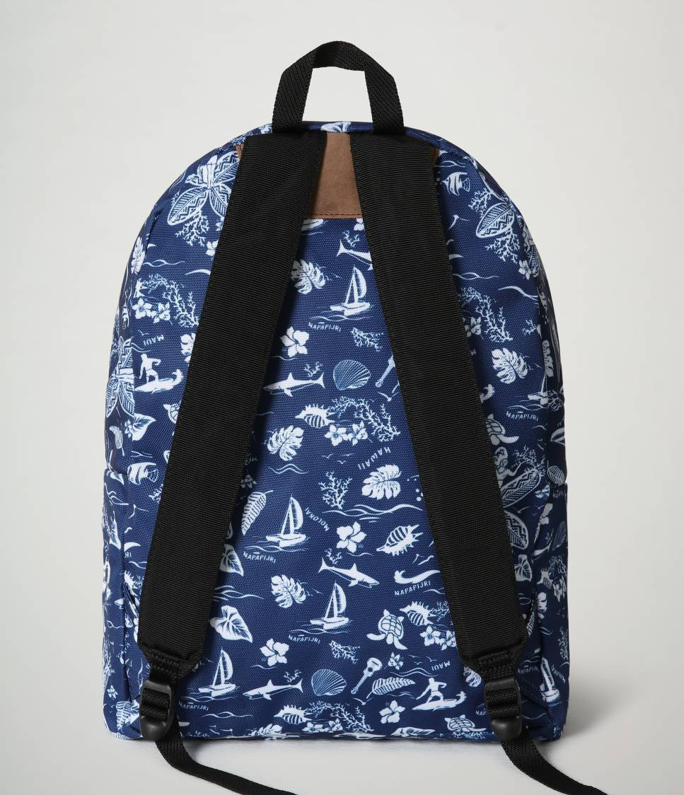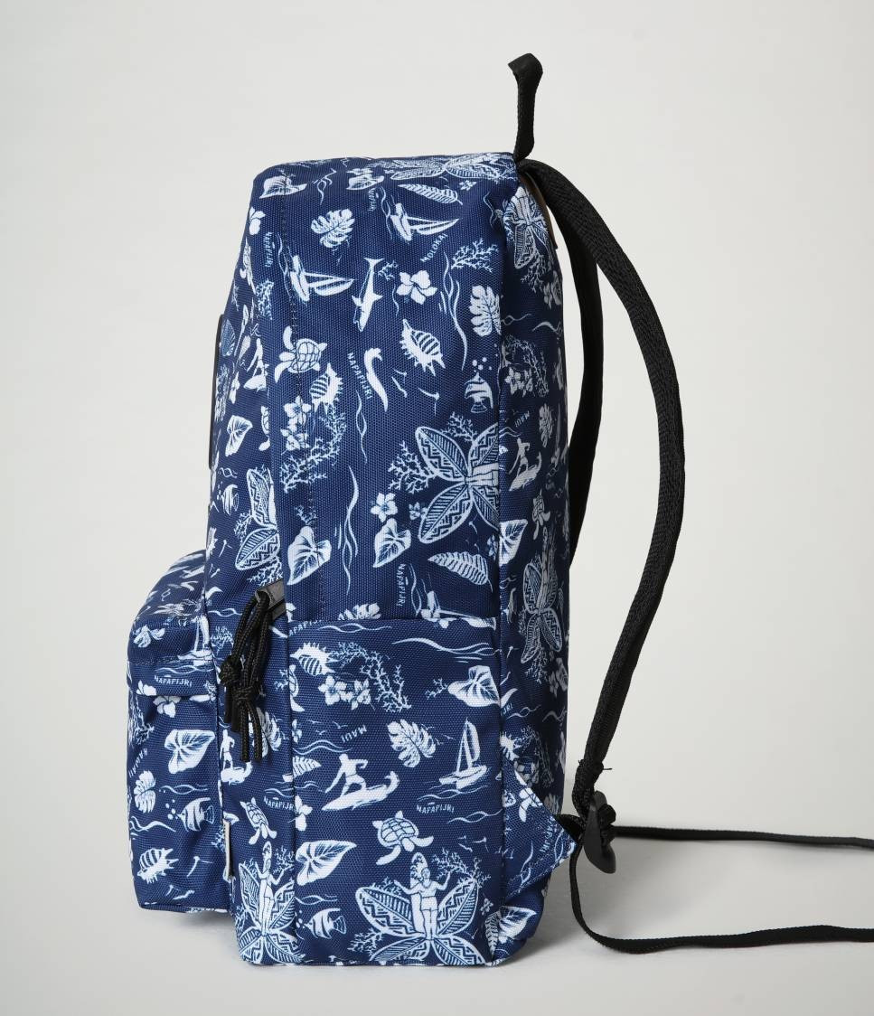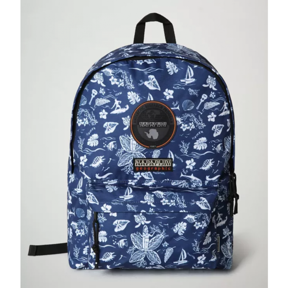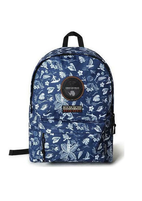 Vícebarevný batoh značky NAPAPIJRI. Batoh je opatřen 2 libovolně nastavitelnými ramenními popruhy, má 1 velkou kapsu a 1 menší obě uzavíratelné pomocí zipu. Přední stranu batohu zdobí nápis a logo NAPAPIJRI.