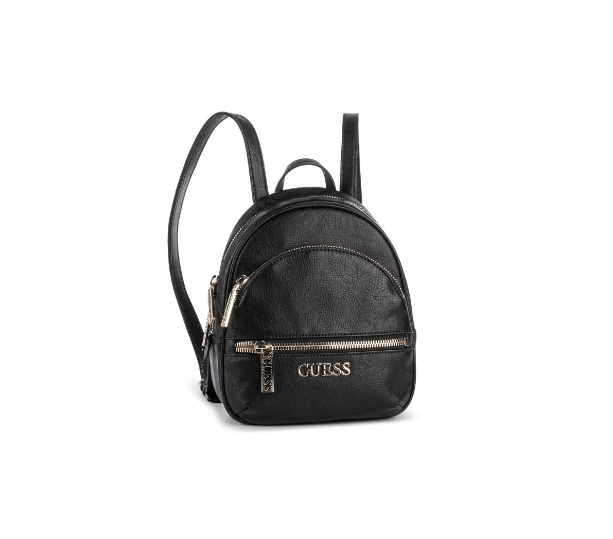 Stylový batoh GUESS. Batoh má 2 černé libovolně nastavitelné ramenní popruhy a 1 rukojeť. Batoh se uzavírá pomocí zipu a zdobí ho zlaté kování.