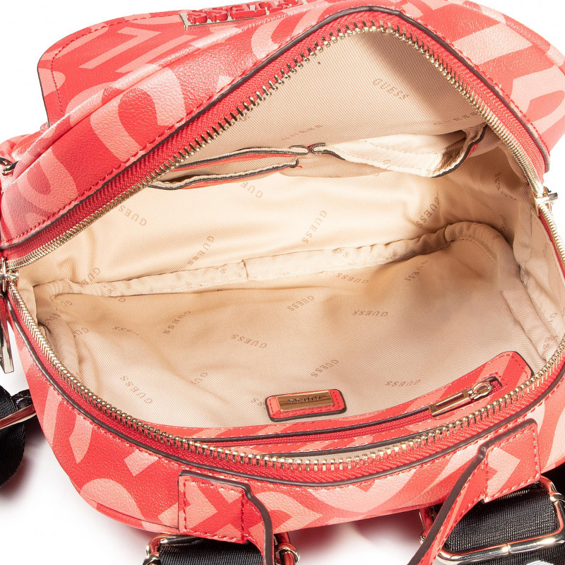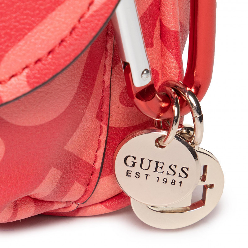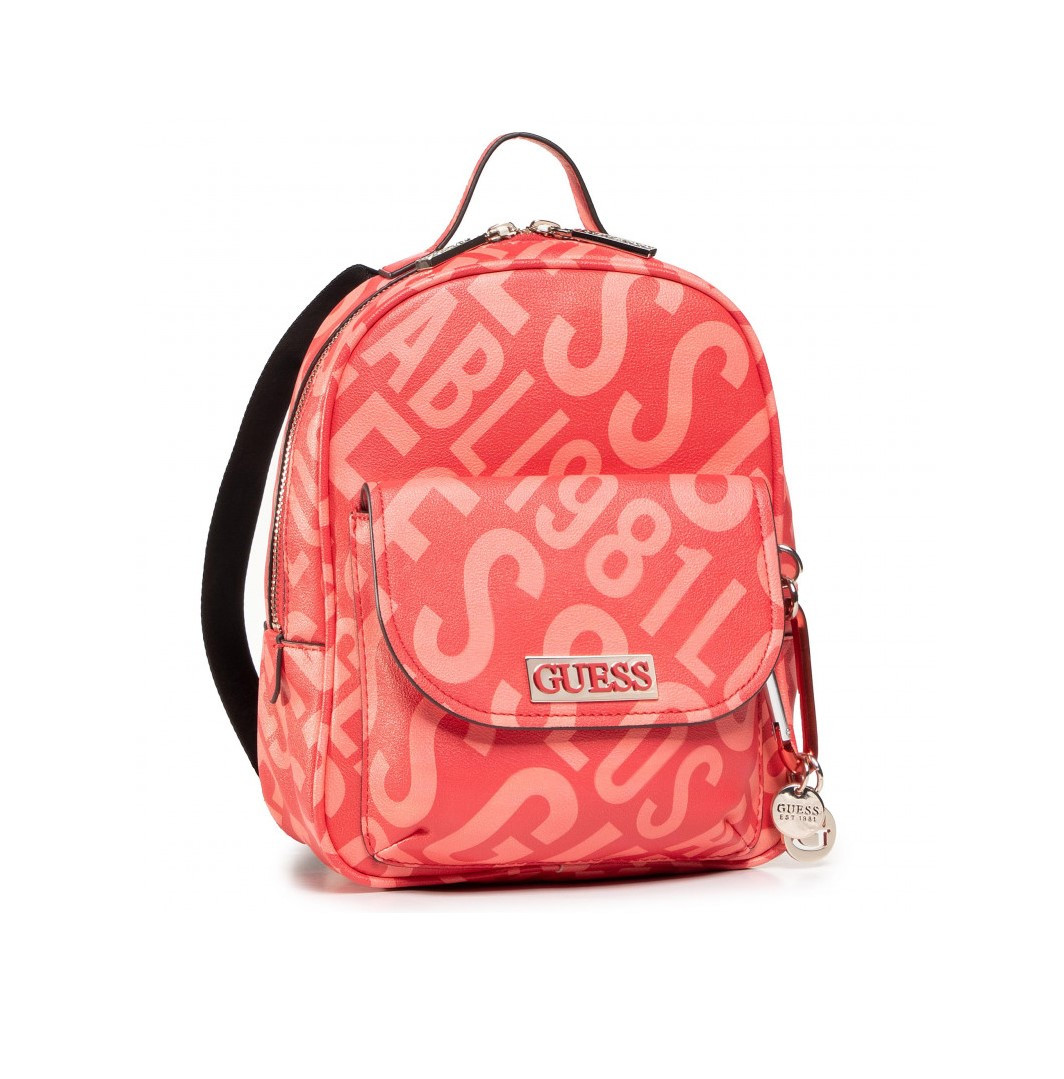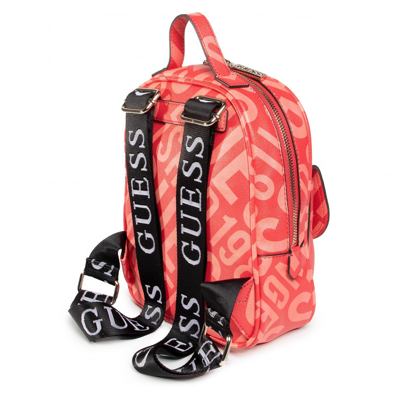 Dámský červený batoh značky GUESS s potiskem. Stylový batoh má jednu velkou komoru uzavíratelnou na zip a jednu menší přední kapsu. Dále má 2 černé ramenní popruhy s bílým potiskem Guess a 1 rukojeť. U batohu je odepínací karabina s přívěskem.