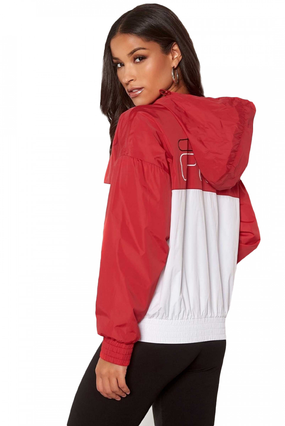 Dámská větrová bunda s kapucí od značky FILA. Stylovou bundu zdobí nápis FILA na hrudi a zádech.