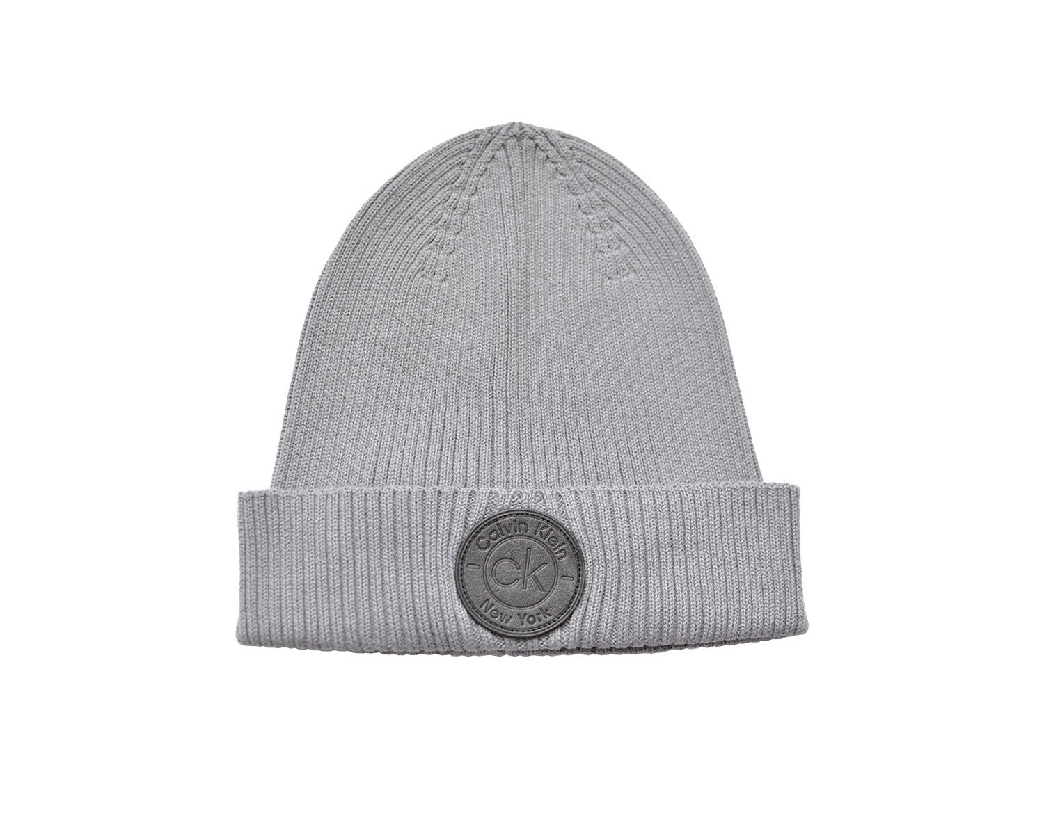 Pánská šedá čepice značky Calvin Klein. Čepice má otočený okraj a zdobí ji kulatý štítek s logem a nápisem Calvin Klein - New York.