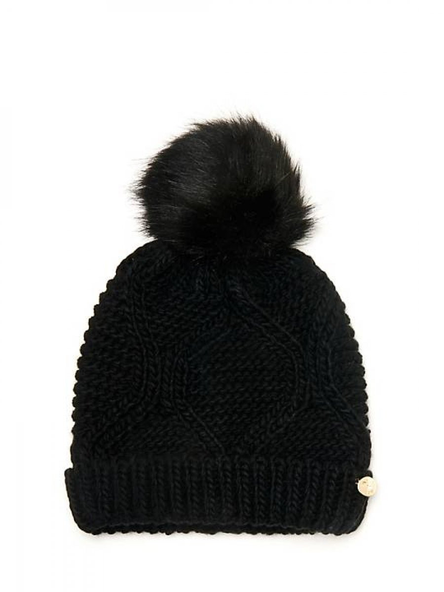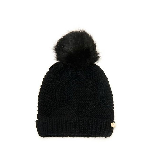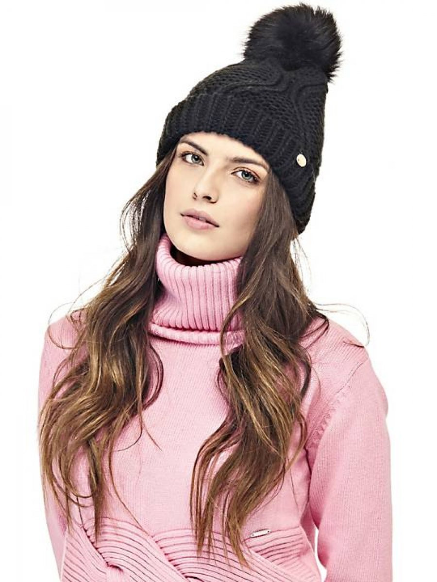 Dámská černá čepice značky GUESS. Pohodlnou čepici zdobí na přední straně zlatý štítek s nápisem GUESS a stylová bambule.