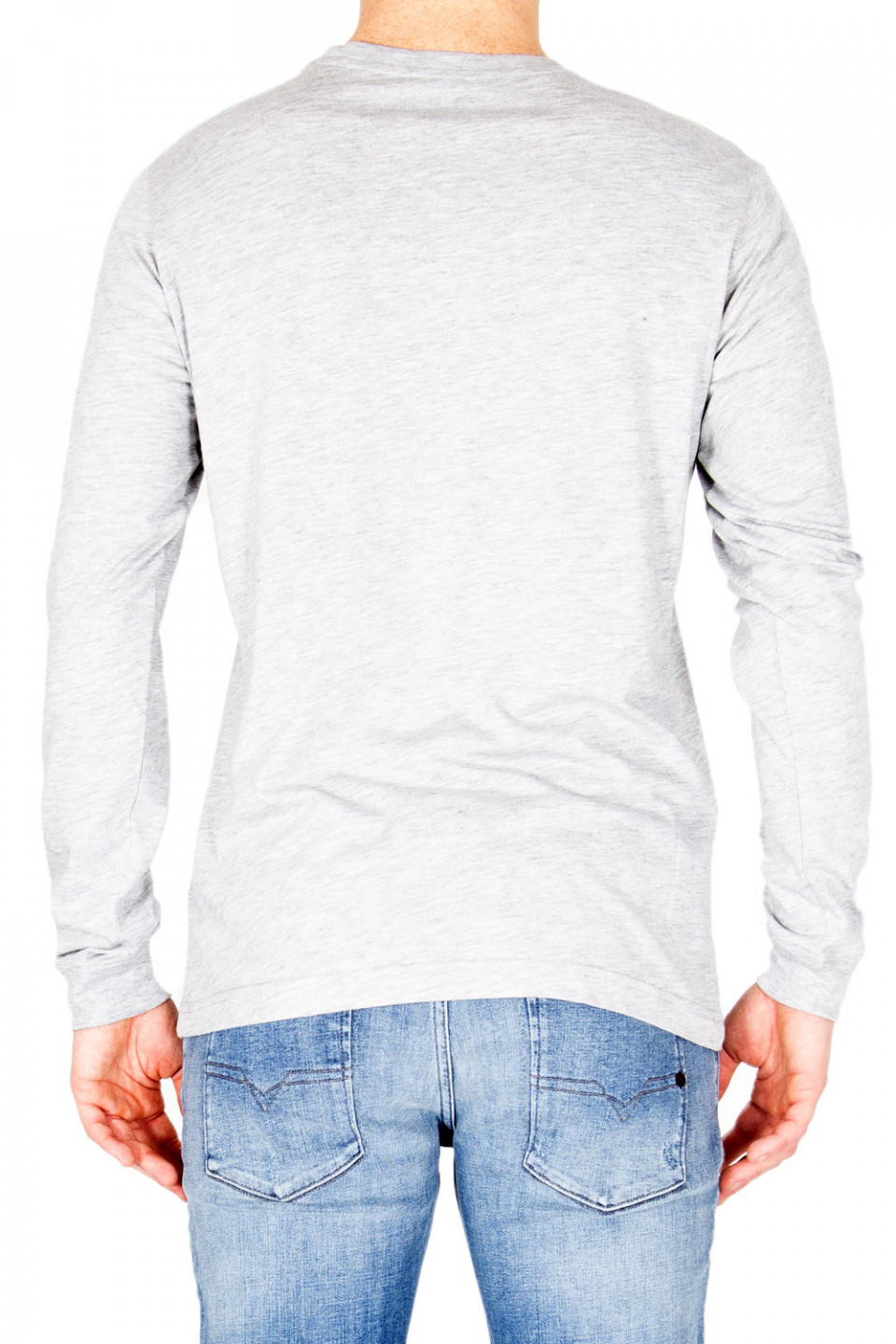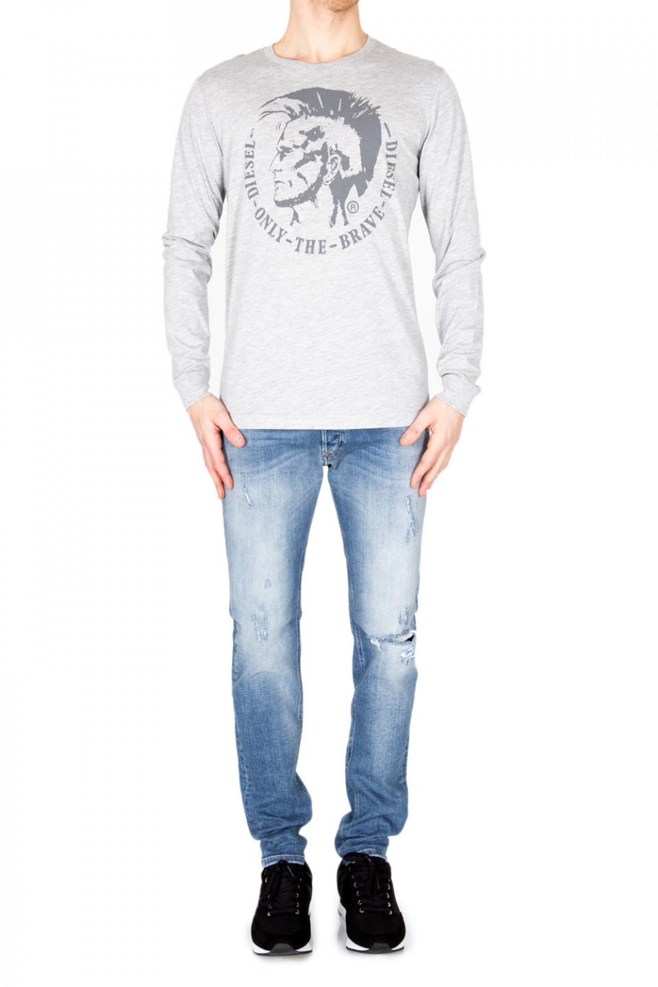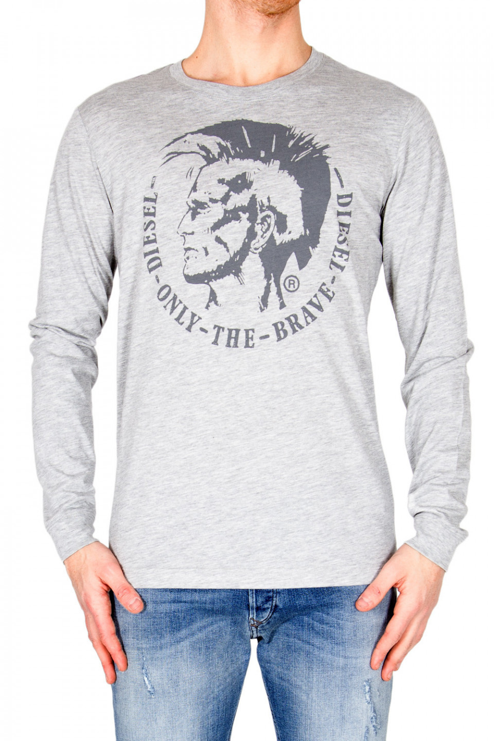 Pánské šedé tričko Diesel s dlouhým rukávem. Pánské tričko zdobí na hrudi černý potisk loga s kruhovým nápisem DIESEL - ONLY - THE - BRAVE - DIESEL. Módní tričko se perfektně hodí do města, práce i na zábavu.