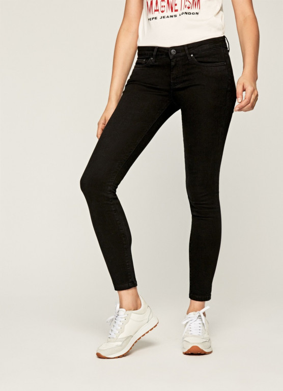 Dámské černé skinny džíny značky Pepe Jeans. Zapínají se pomocí zipu a knoflíku. Na zadní straně kalhot je černé logo Pepe Jeans.