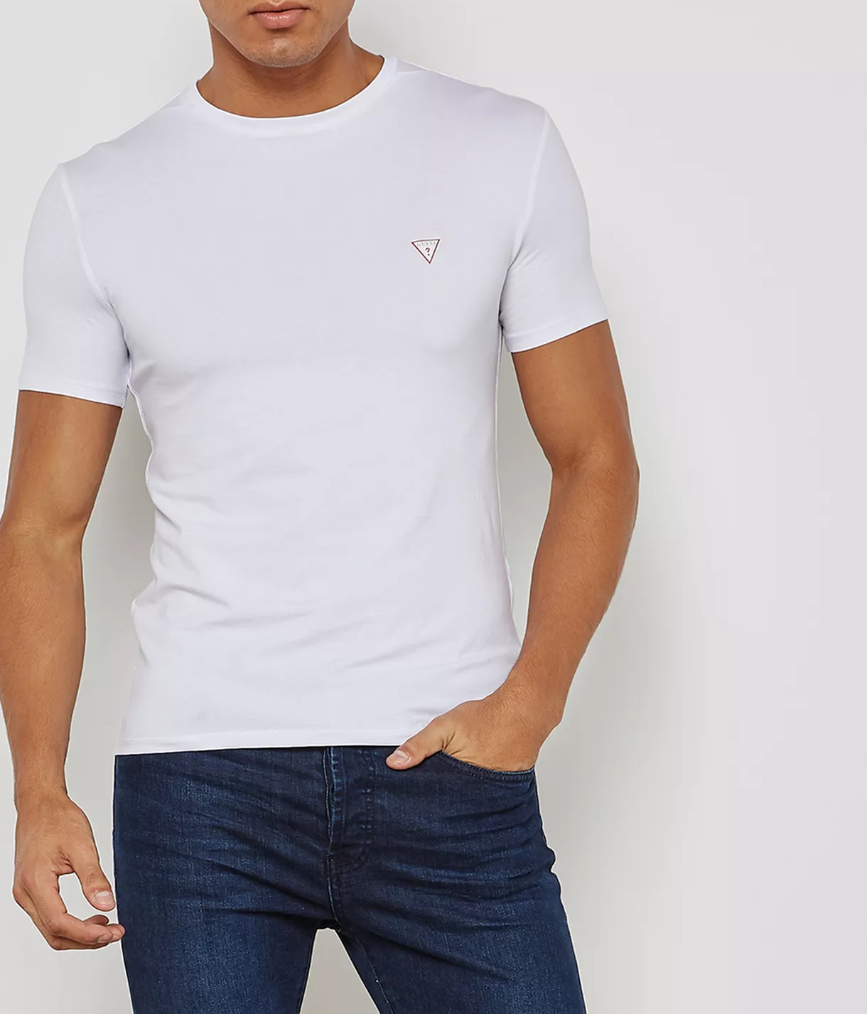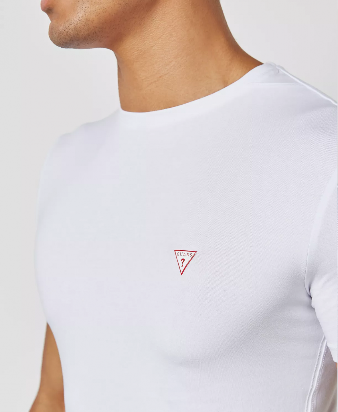 Bílé pánské tričko GUESS s krátkým rukávem a kulatým výstřihem. Tričko zdobí na levé části hrudi červený trojúhelník s logem GUESS. Tričko se hodí do práce, do města i na zábavu. Doporučená péče o tričko: praní při 30°C na jemný cyklus.