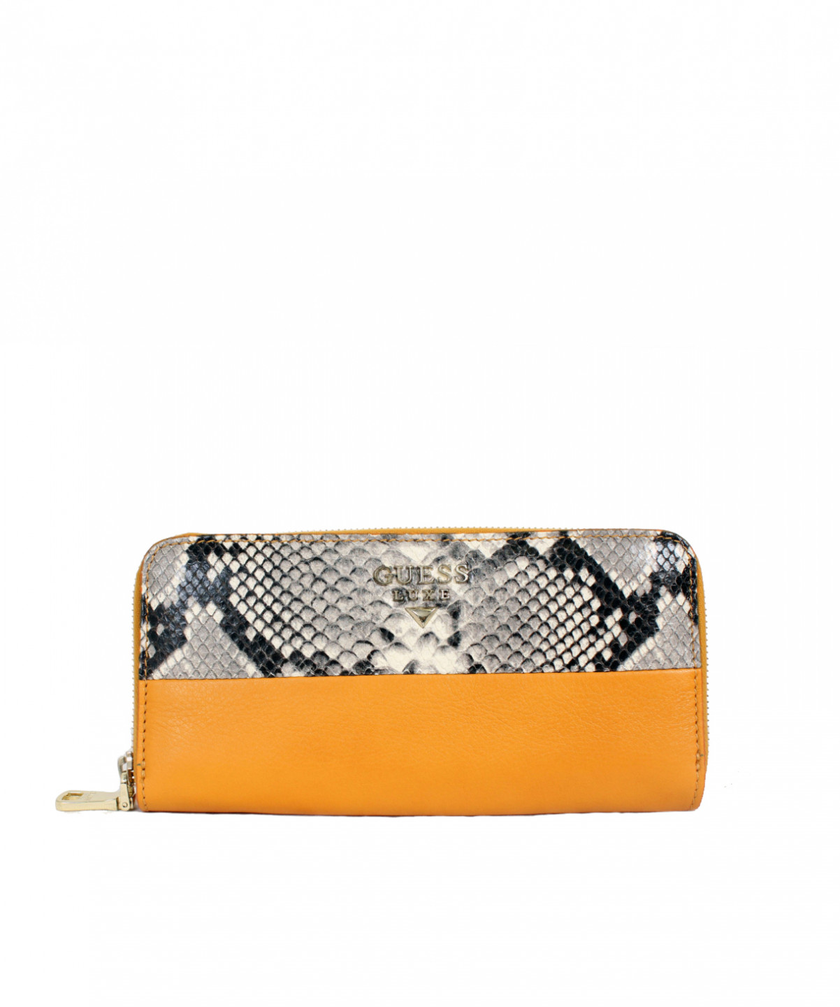 Trendy žlutá peněženka GUESS. Uvnitř se nachází 3 přihrádky z toho 1 na zip, 2 velké podélné přihrádky a 12 přihrádek na karty. Peněženku zdobí na přední straně vzor hadí kůže se zlatým nápisem GUESS LUXE.