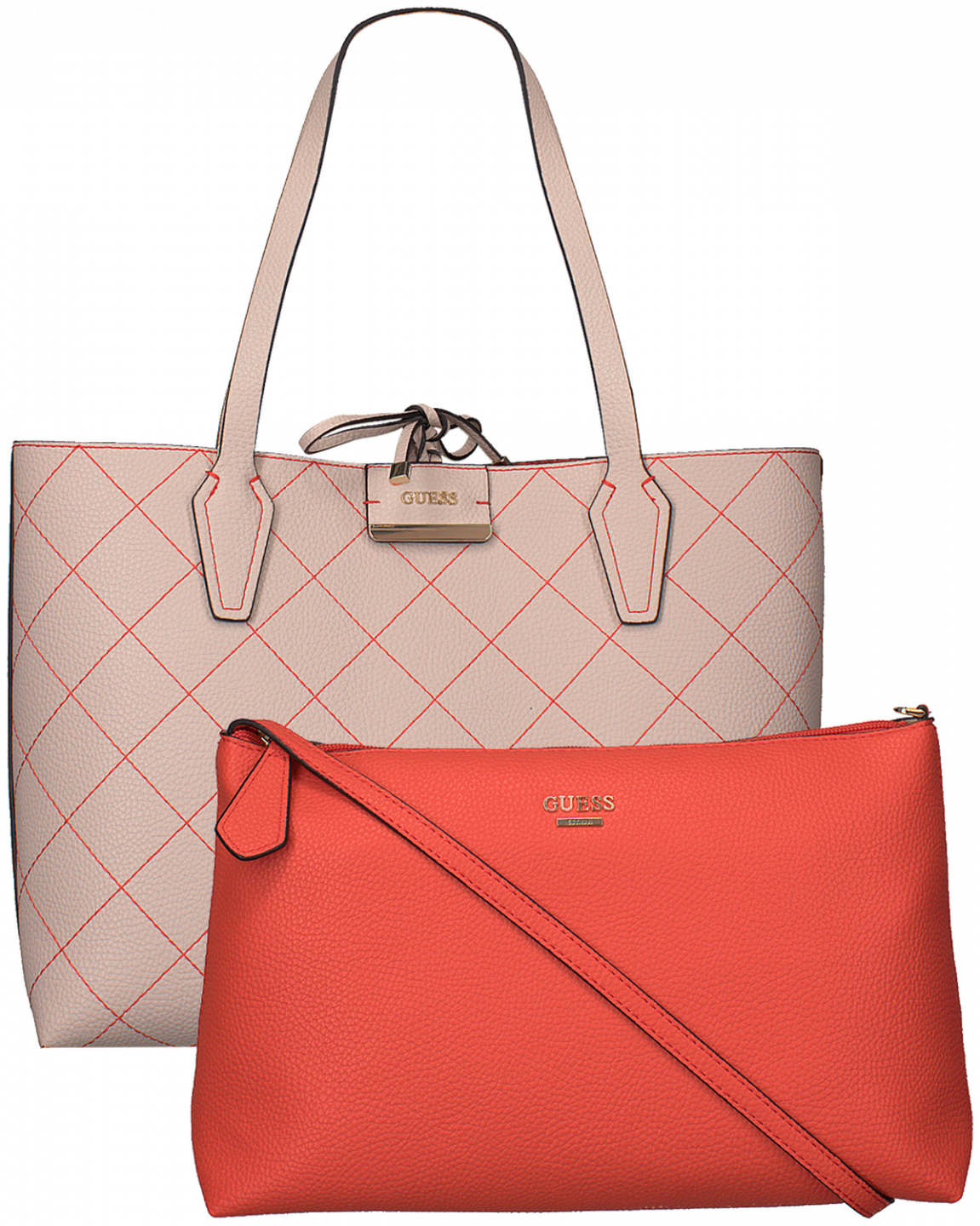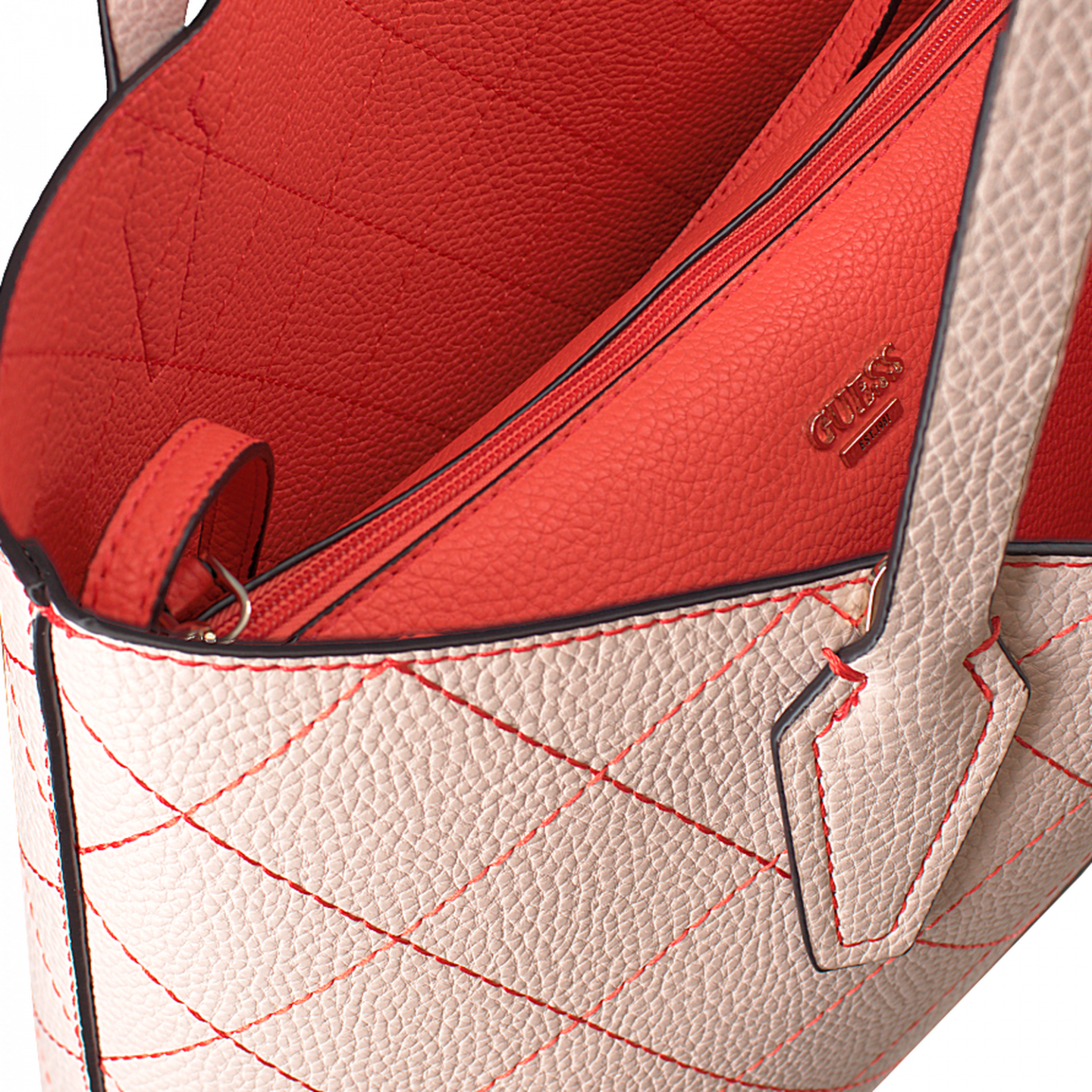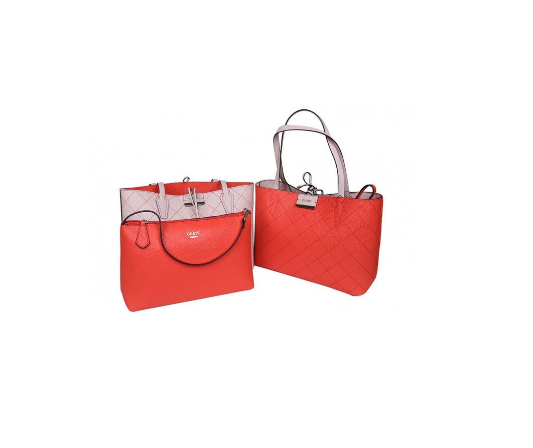 Trendy růžová kabelka GUESS přes rameno ke všem příležitostem.  Kabelka je oboustranná, z druhé strany má oranžovou barvu a díky tomu ji lze využít k více outfitům. Kabelka se uzavírá pomocí šněrování. Je opatřena 2 rukojeti. Uvnitř se nachází odnímatelné pouzdro, které můžete použít jako samostatné psaníčko.. Kabelku zdobí nápadité oranžové prošívání a zlaté logo GUESS.