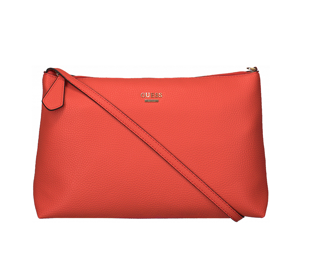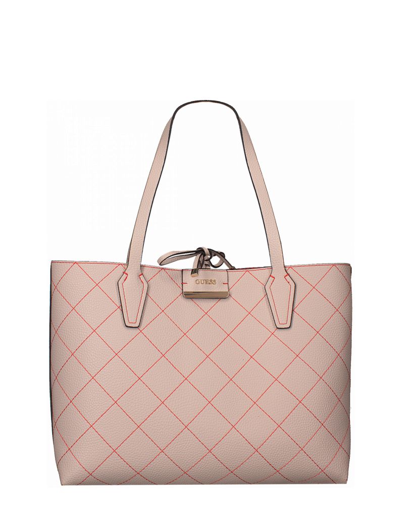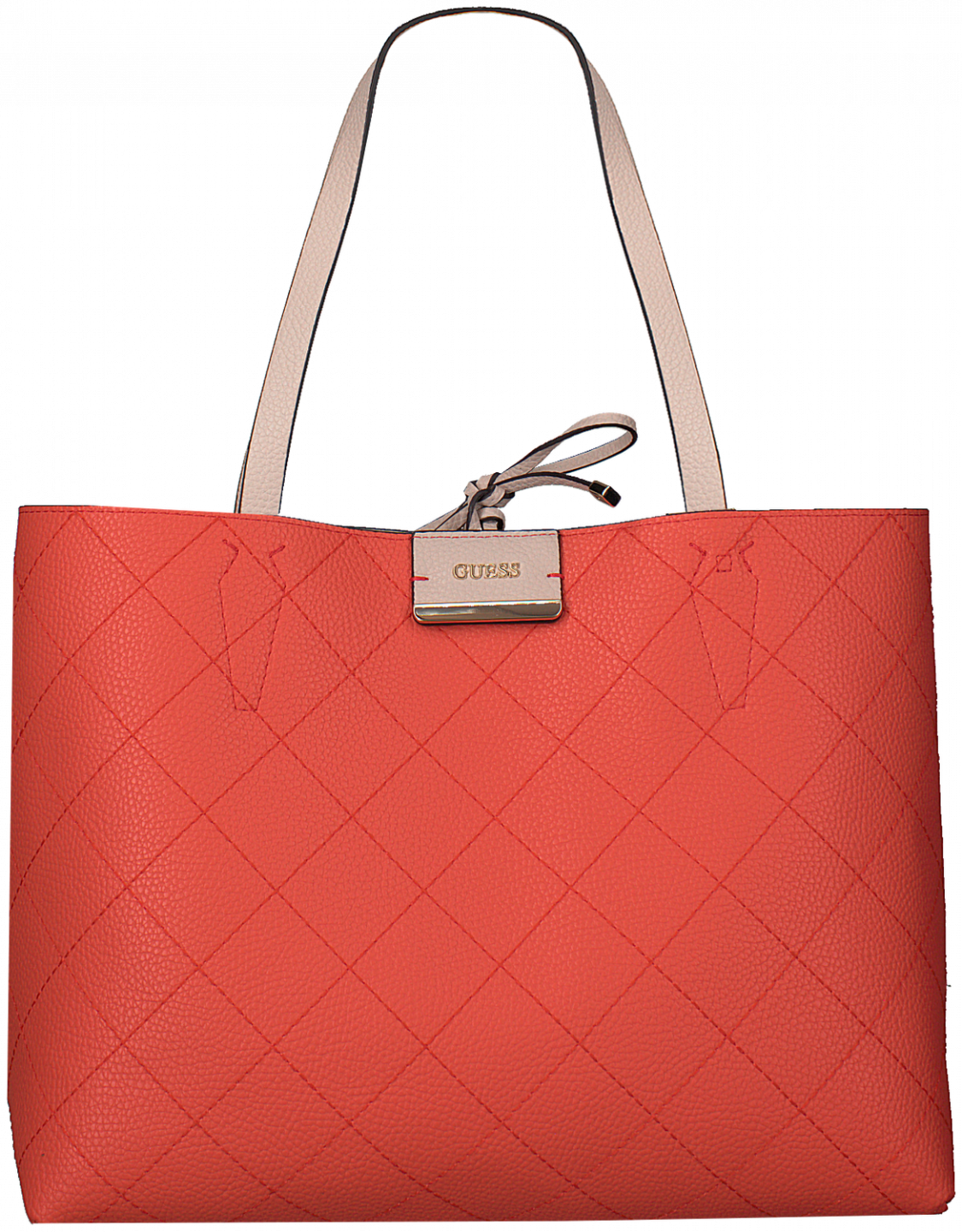 Trendy růžová kabelka GUESS přes rameno ke všem příležitostem.  Kabelka je oboustranná, z druhé strany má oranžovou barvu a díky tomu ji lze využít k více outfitům. Kabelka se uzavírá pomocí šněrování. Je opatřena 2 rukojeti. Uvnitř se nachází odnímatelné pouzdro, které můžete použít jako samostatné psaníčko.. Kabelku zdobí nápadité oranžové prošívání a zlaté logo GUESS.