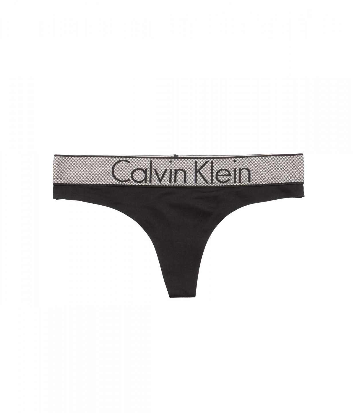 Dámská černá tanga značky Calvin Klein. Kalhotky jsou vyrobeny z pohodlného materiálu a mají příjemný střih, který perfektně padne a dokonale sedí. Šedý pas má v sobě elastickou gumu a je ozdoben černým nápisem Calvin Klein.