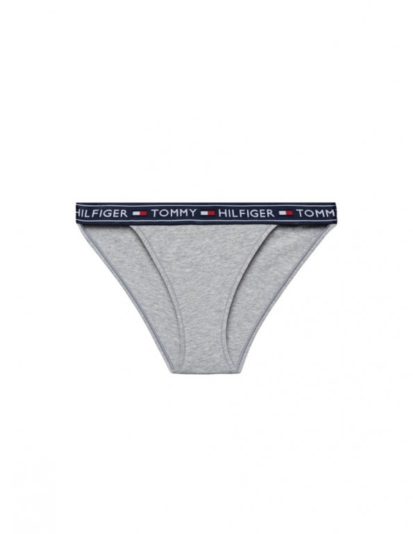 Dámské šedé kalhotky značky Tommy Hilfiger. Kalhotky typu bikiny jsou vyrobeny z pohodlného bavlněného materiálu a mají příjemný střih, který perfektně padne, dokonale sedí a vytváří krásné pozadí ženy. Kalhotky zdobí modrý elastický pas, který je ozdoben bílým nápisem TOMMY HILFIGER..