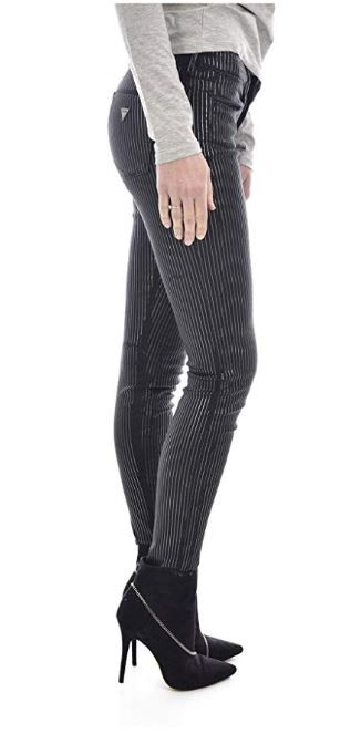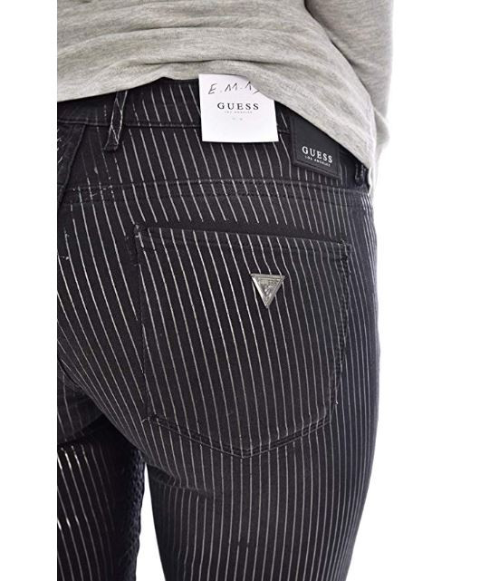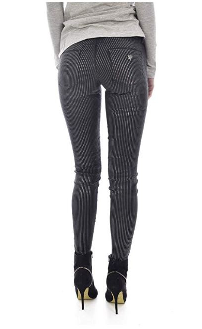Dámské černé kalhoty s metalickými stříbrnými pruhy. Stylové kalhoty zdobí štítek s logem Guess a kožená aplikace na zadní části pasu.