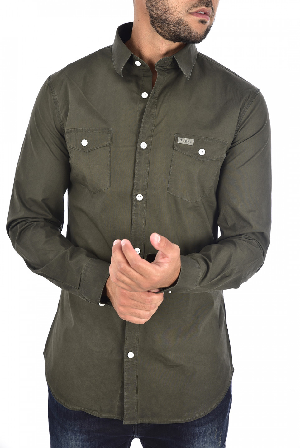 Pánská khaki košile značky GUESS. Pohodlná košile s dlouhým rukávem se zapíná pomocí knoflíků, zdobí ji náprsní kapsy a na levé kapse ji zdobí logo GUESS. Zadní stranu trendy košile zdobí potisk.