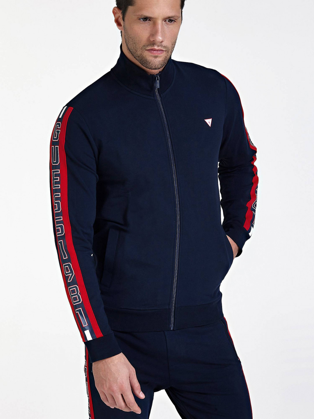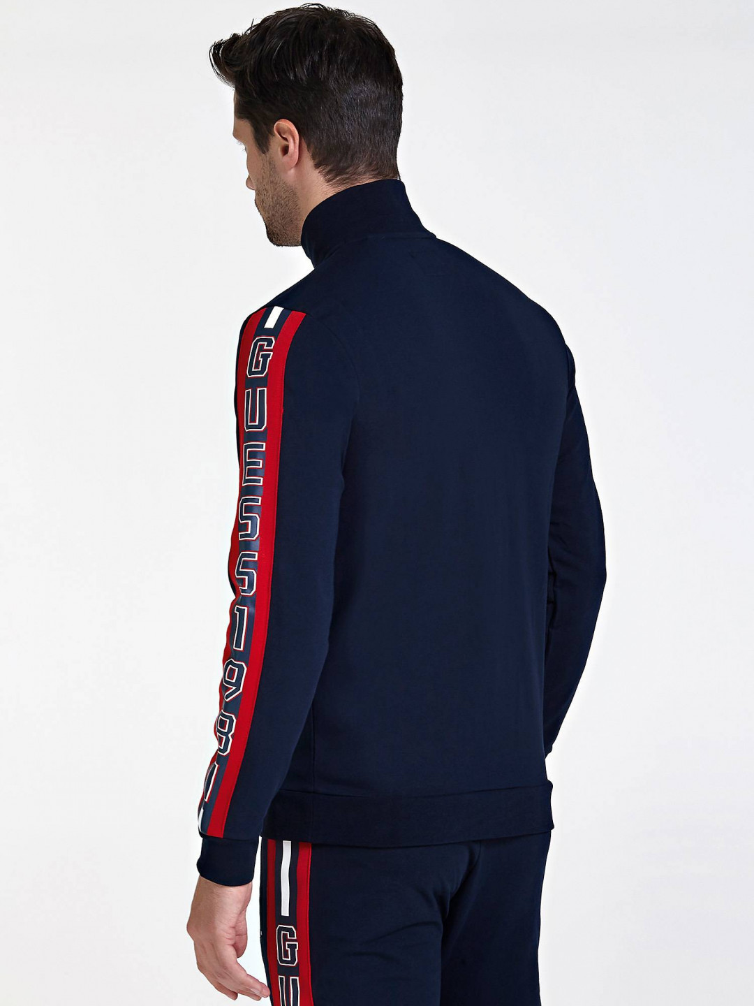 Pánská tmavě modrá mikina GUESS. Pohodlná mikina se zapíná pomocí zipu a zdobí ji na rukávech bílo červený nápis GUESS 1981.
