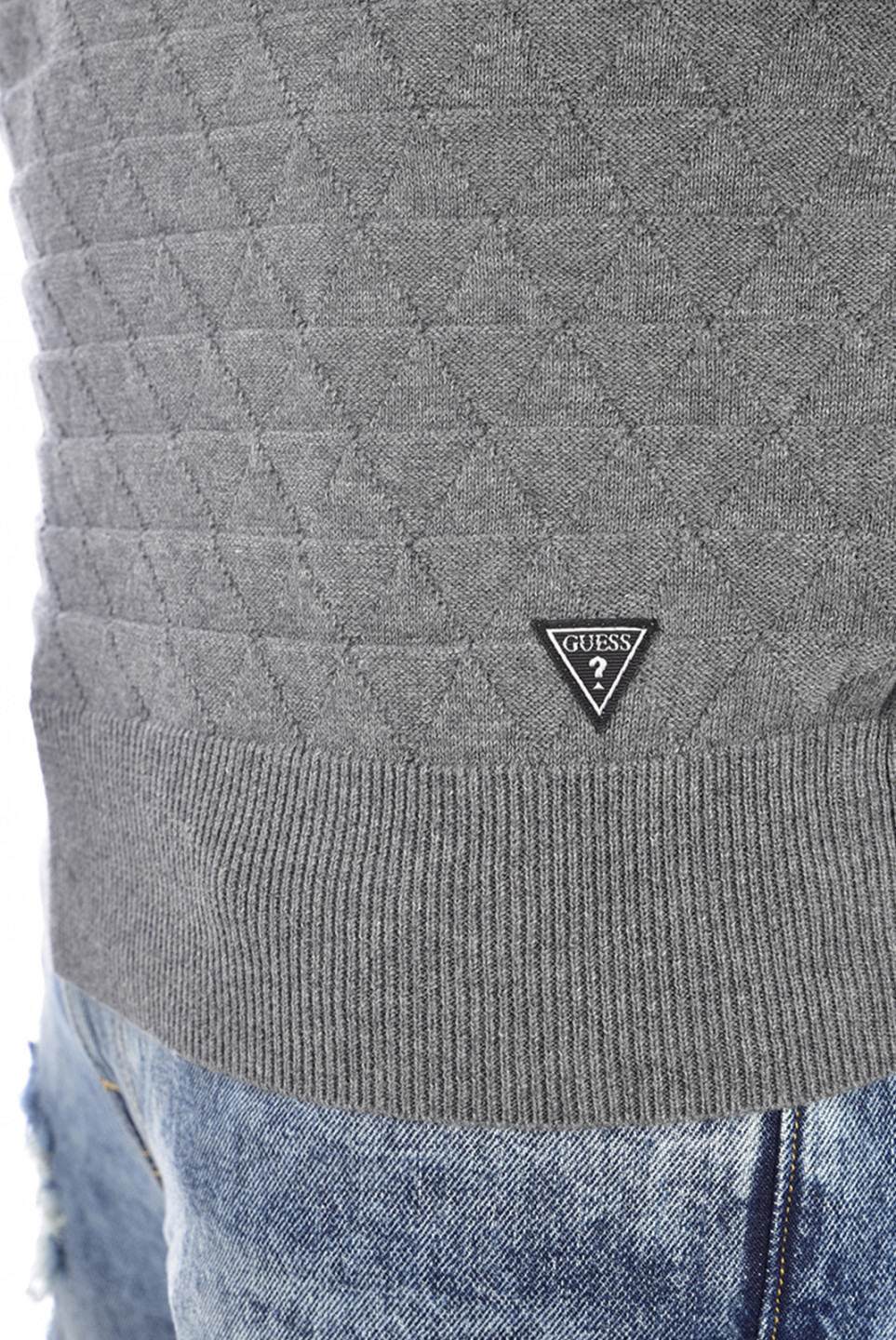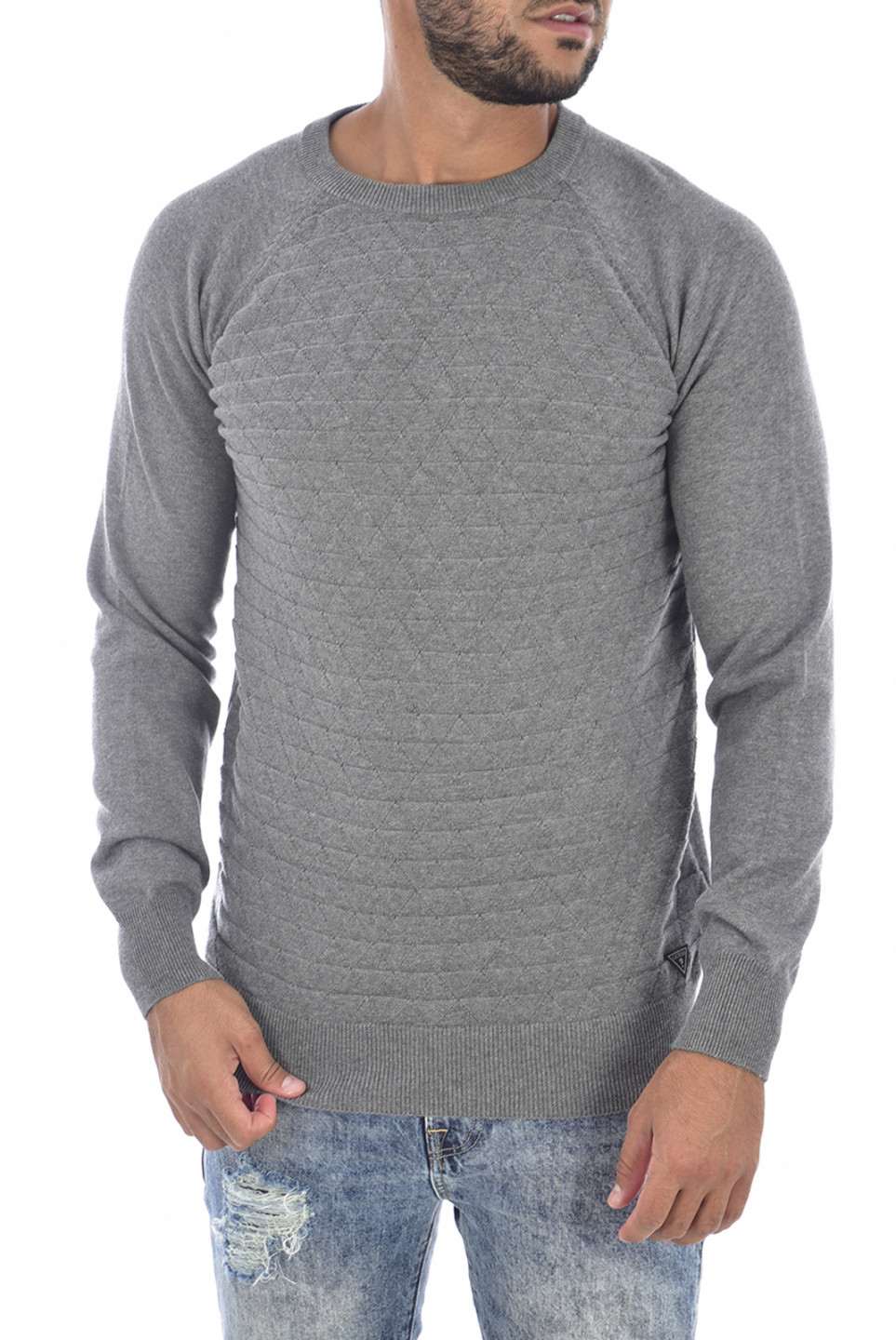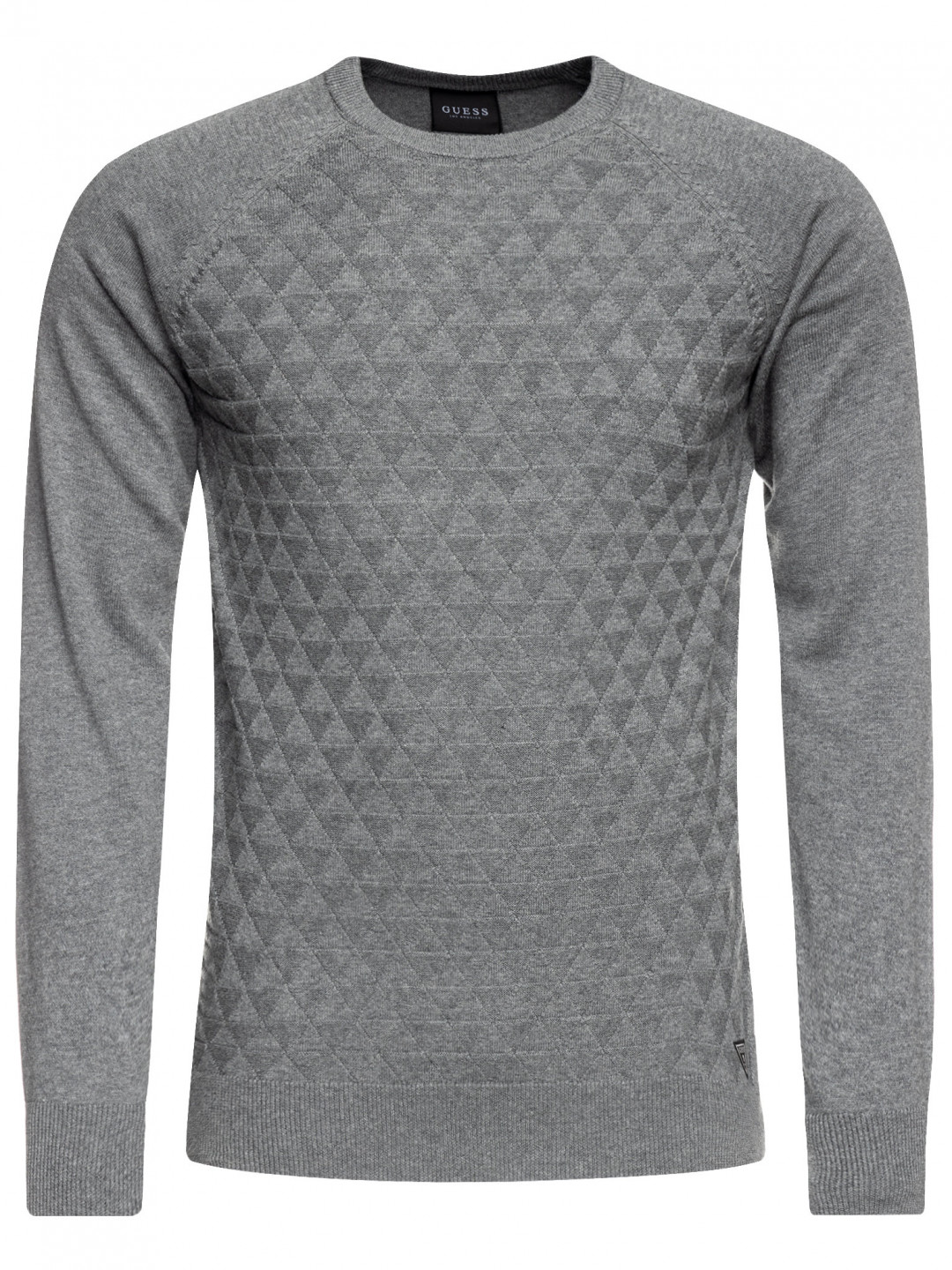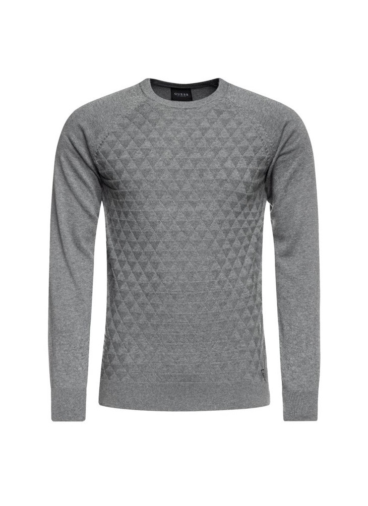 Pánský šedý svetr GUESS. Stylový svetr zdobí motivy na hrudi a štítek s logem Guess ve spodní části.