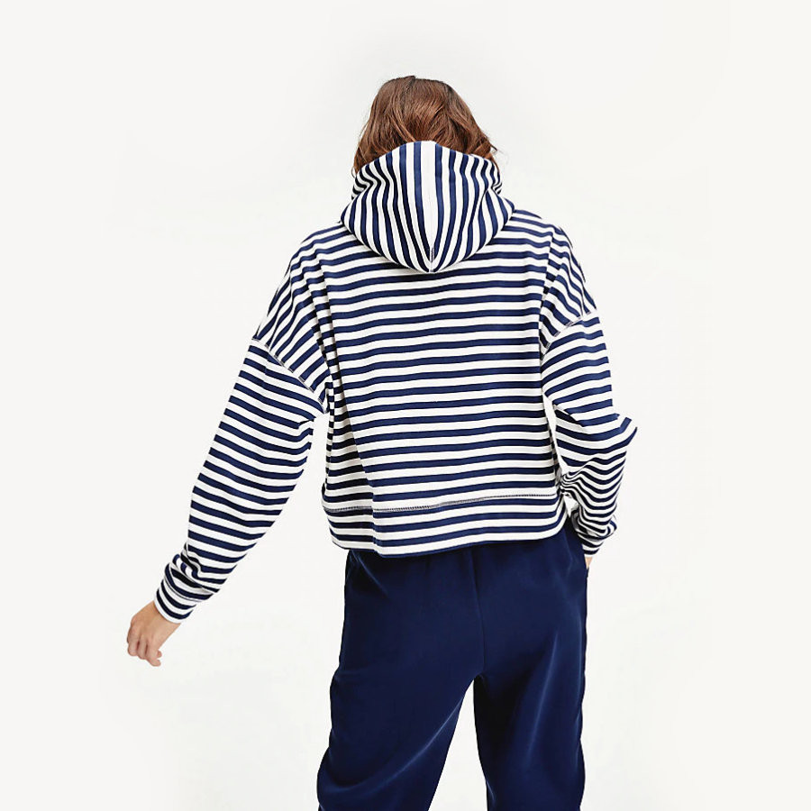 Dámská pruhovaná mikina značky Tommy Jeans. Stylovou krátkou mikinu s kapucí zdobí na levém rukávu logo značky.