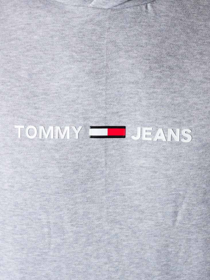 Pánská šedá mikina s kapucí Tommy Jeans. Mikina má klokaní kapsu a stahovací šňůrky na kapuci. Na hrudi zdobí mikinu bílý nápis Tommy Jeans.