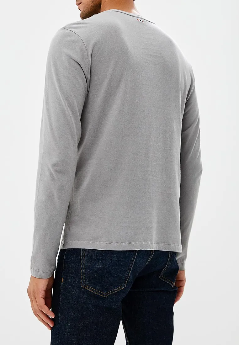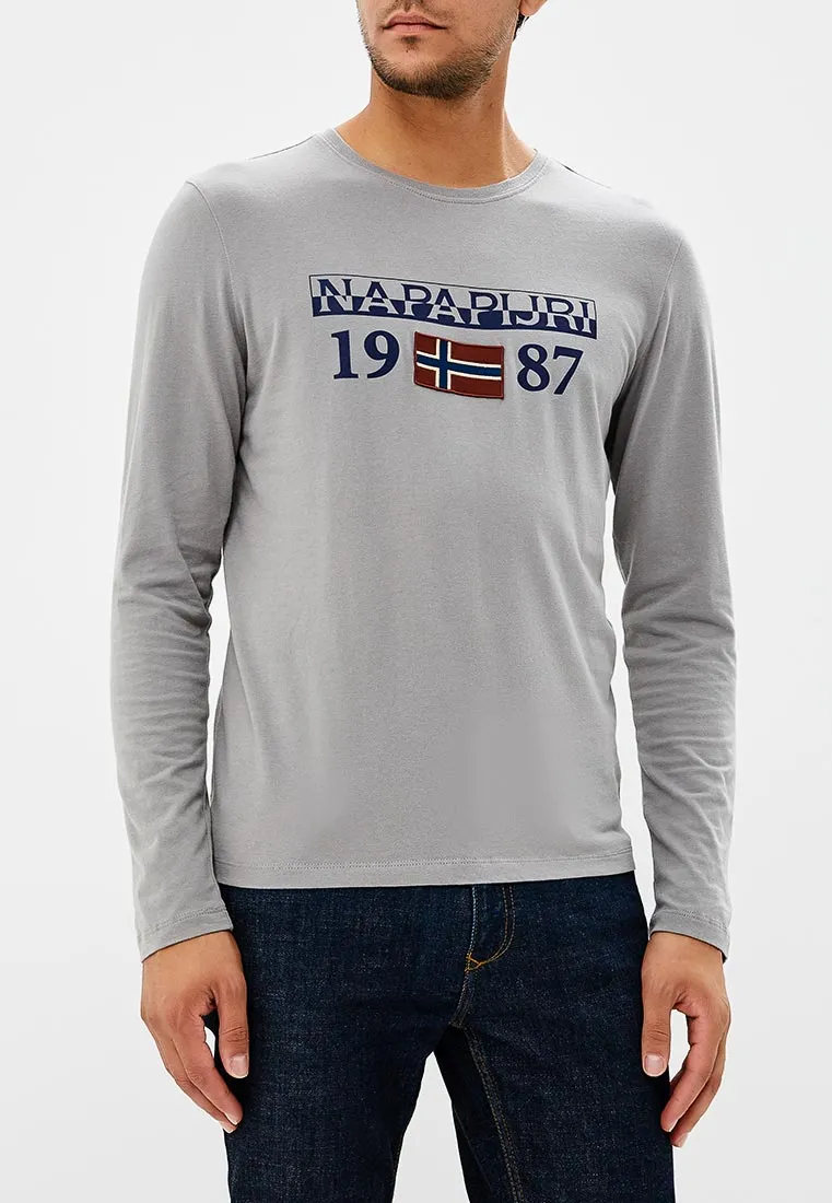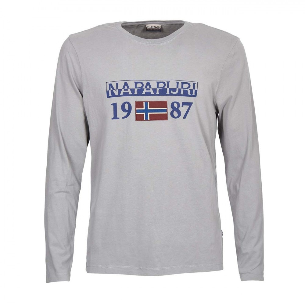 Pánské světle šedé tričko značky NAPAPIJRI. Módní pánské tričko s dlouhým rukávem a kulatým výstřihem zdobí na hrudi modré logo NAPAPIJRI.  Nadčasové tričko se perfektně hodí do práce, do města i na zábavu.