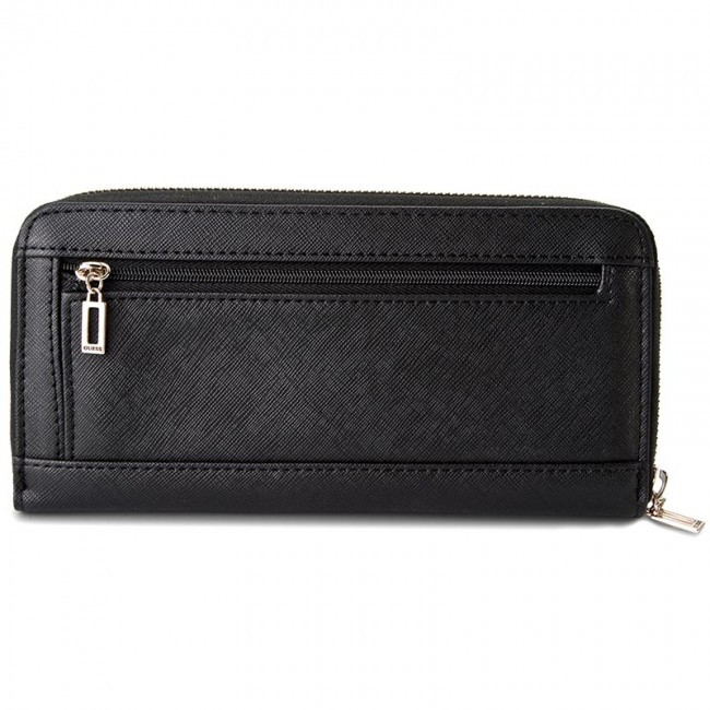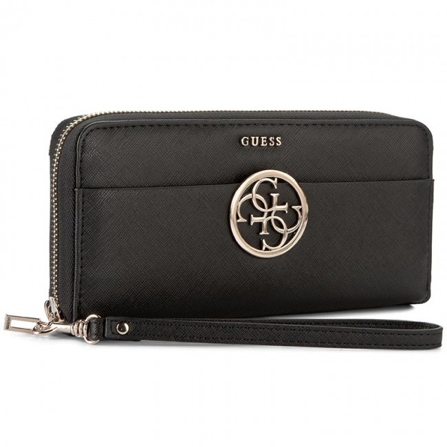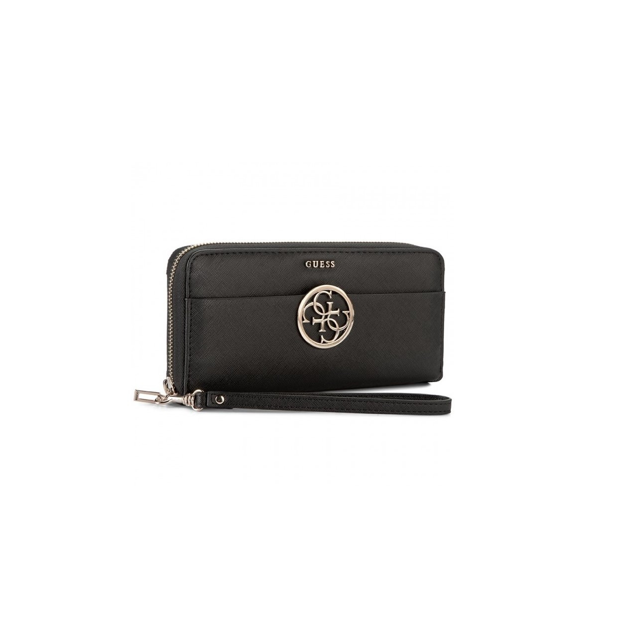 Černá velká peněženka GUESS. Uvnitř se nachází přihrádky na karty, uzavíratelná kapsa na mince a velké kapsy na bankovky. Peněženku zdobí zlaté kování.