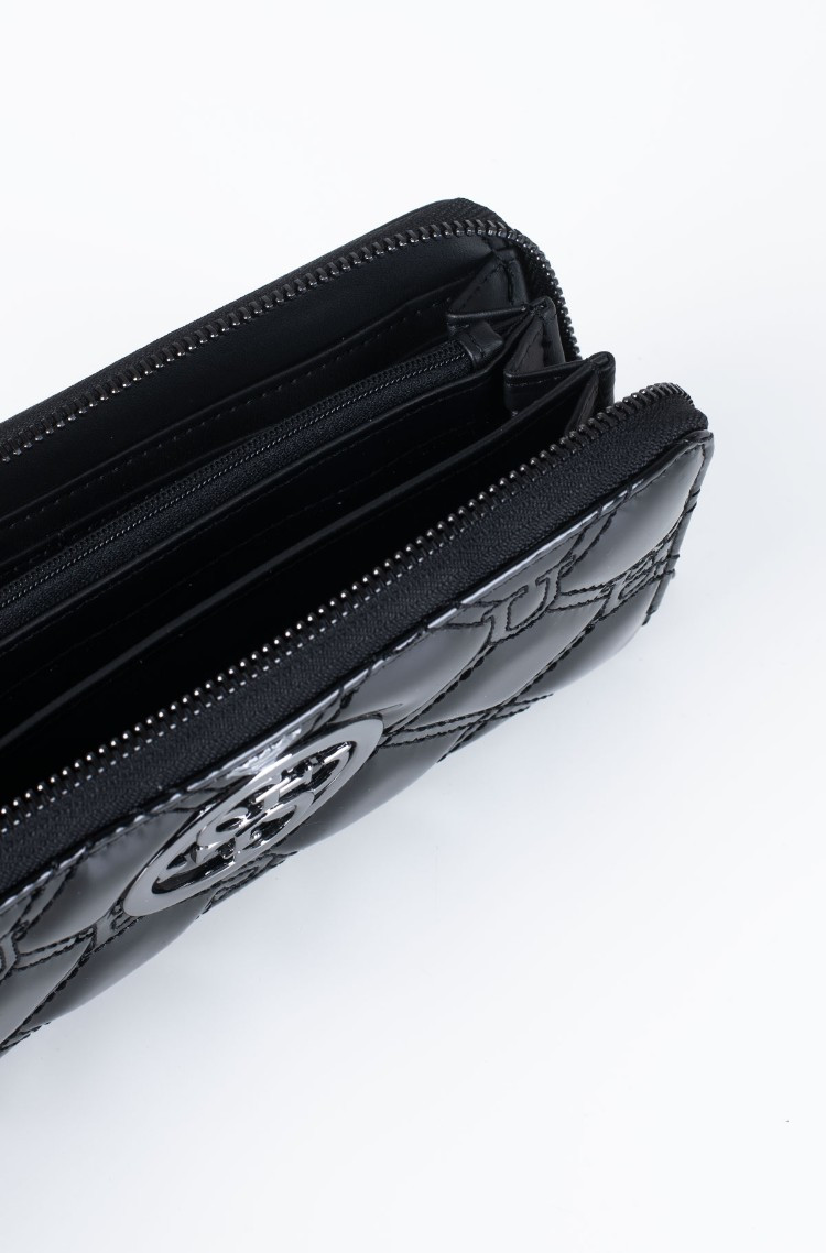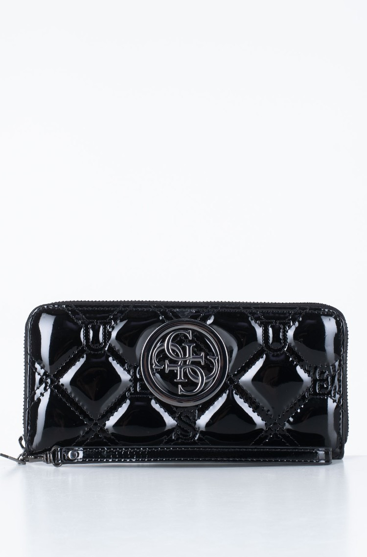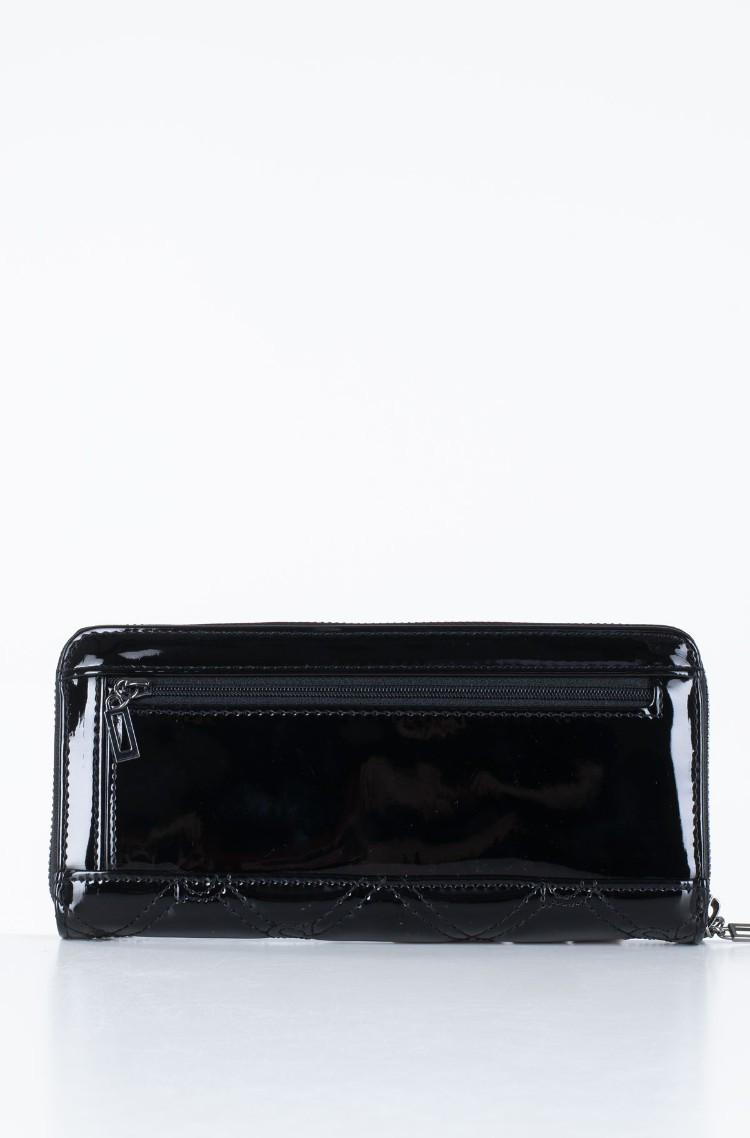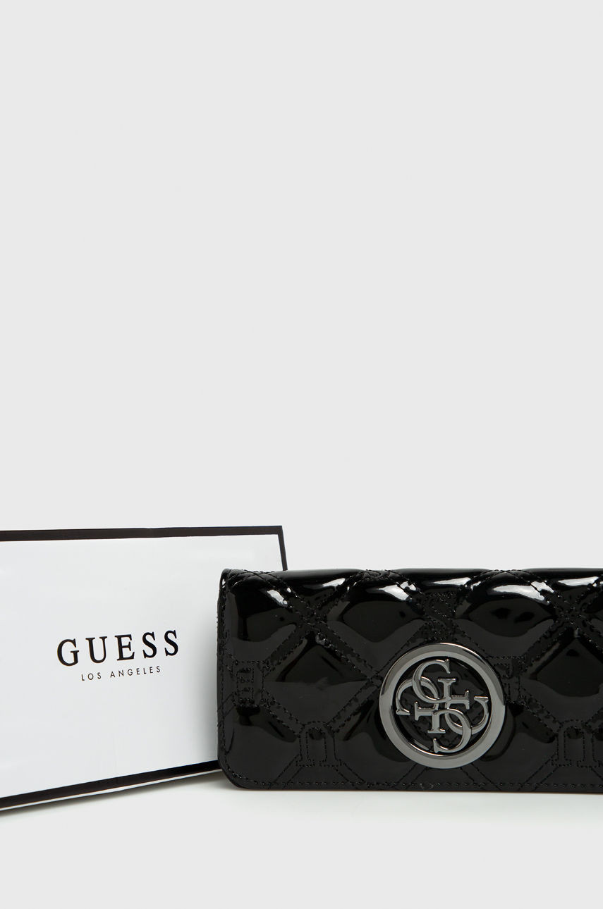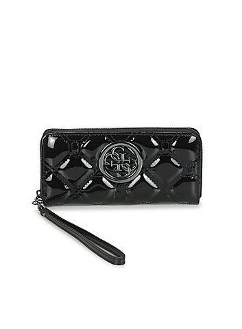 Lesklá černá peněženka značky GUESS. Uvnitř se nachází přihrádky na karty, uzavíratelná kapsa na mince a kapsy na bankovky. Přední stranu peněženky zdobí šedé kování a logo GUESS. Na zadní straně se nachází malá kapsa uzavíratelná pomocí zipu. Peněženka má praktické poutko na ruku.