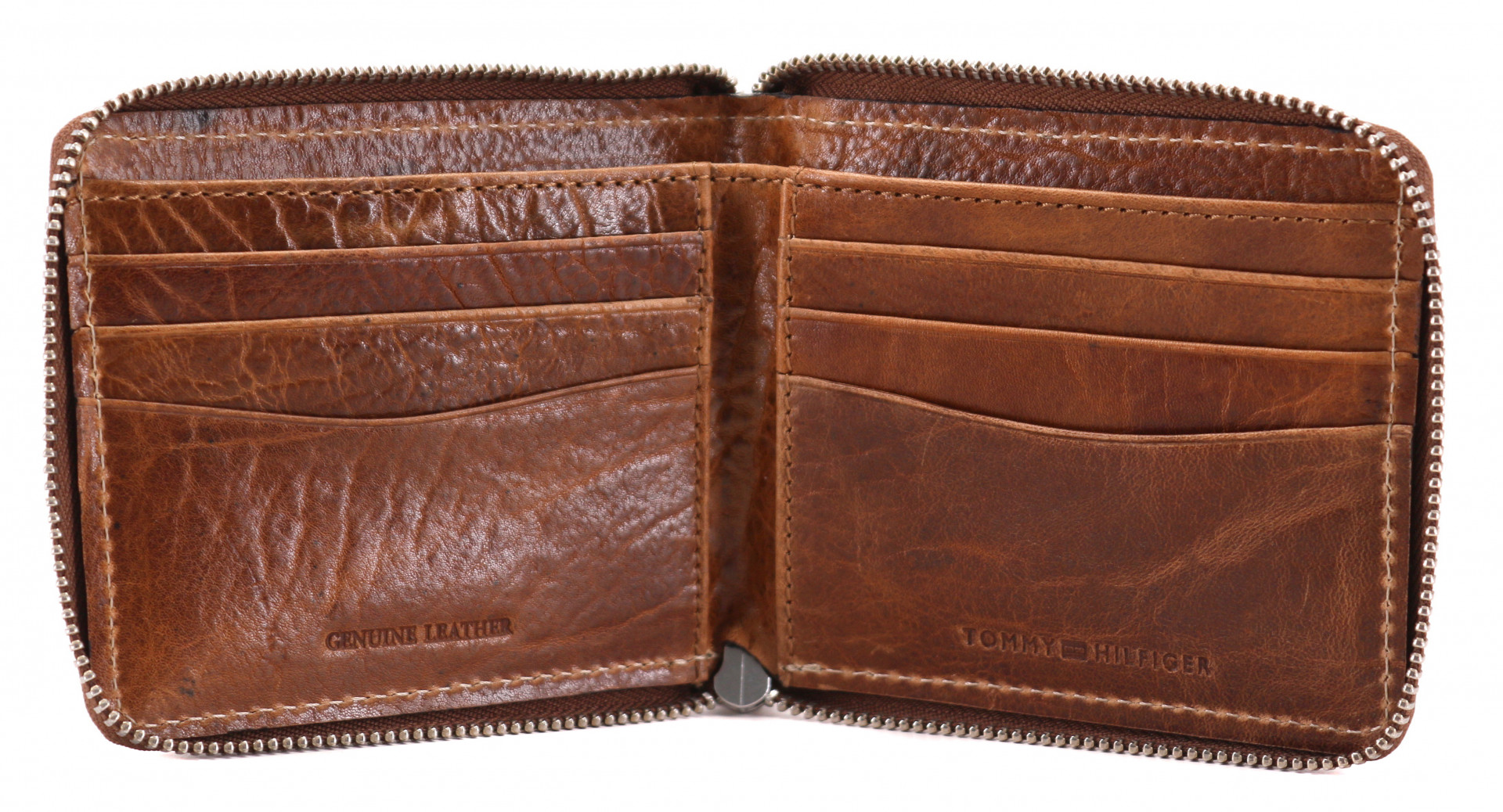 Hnědá pánská peněženka značky TOMMY HILFIGER. Kožená peněženka se zapíná pomocí zipu, uvnitř má 6 přihrádek na karty a jednu velkou kapsu na bankovky. Design peněženky je navržen tak, aby se pohodlně a bez problémů vešla do Vaší kapsy a nepřekážela Vám při každodenních činnostech. Peněženku zdobí uvnitř vyrytý nápis loga TOMMY HILFIGER a na přední straně v pravé dolní části velké písmenko H a pod ním HILFIGER. Peněženka nemá přihrádku na drobné.