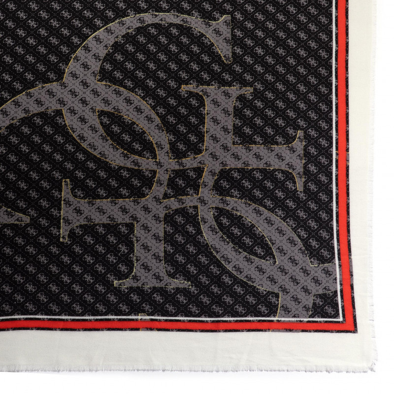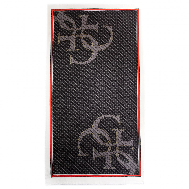 Dámský černý šátek značky GUESS. Šátek obdélníkového tvaru je celý potištěn logy Guess. Zdobí ho roztřepené bílé lemování.