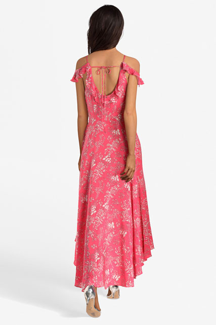 Stylové dámské šaty Guess. Lehké šaty s odhalenými rameny jsou zdobeny volány a květinovou aplikací.