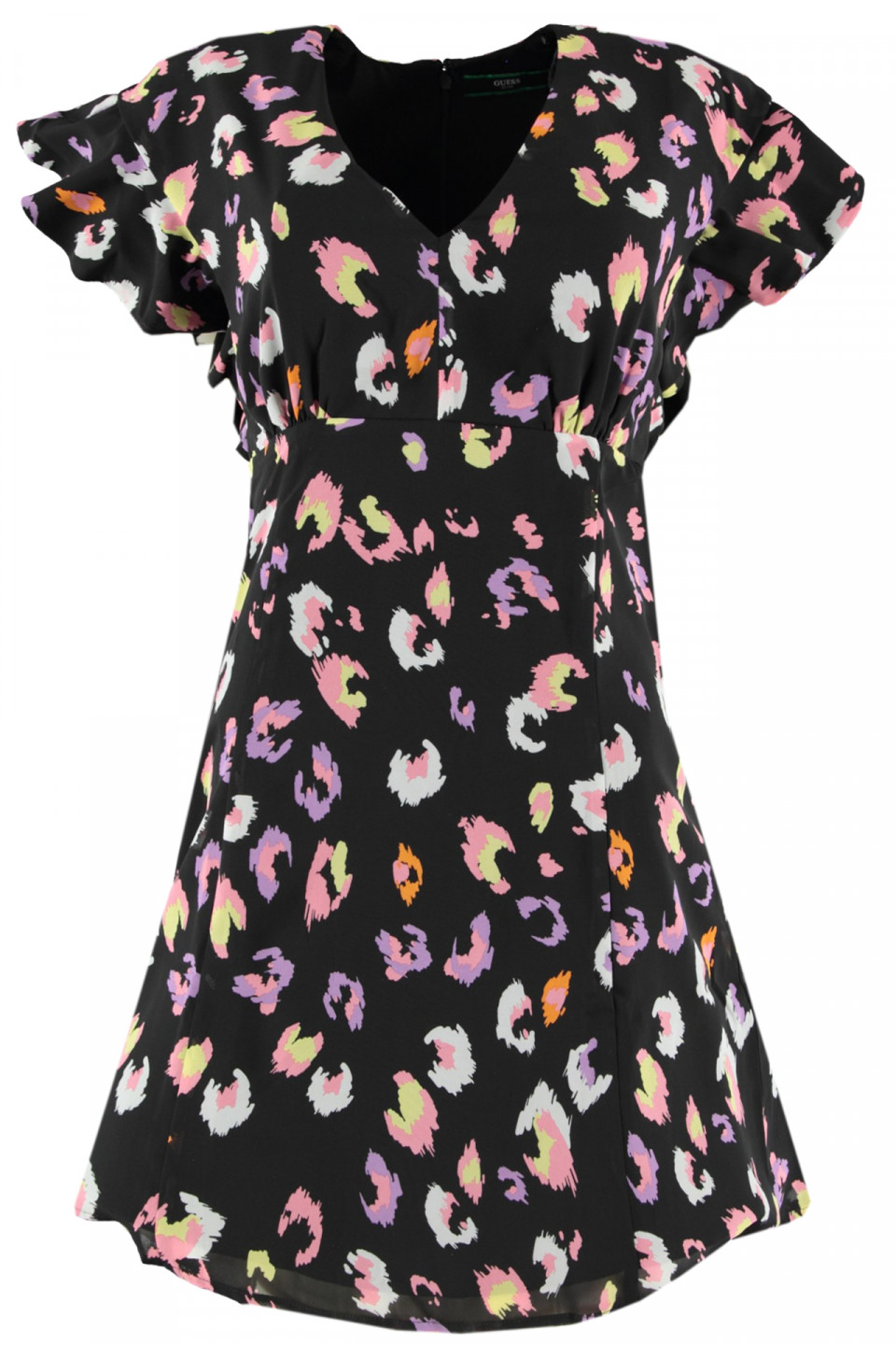 GUESS dámské vzorované volánkové šaty. Lehké šaty mají výstřih do V a jsou zúžené v pase.