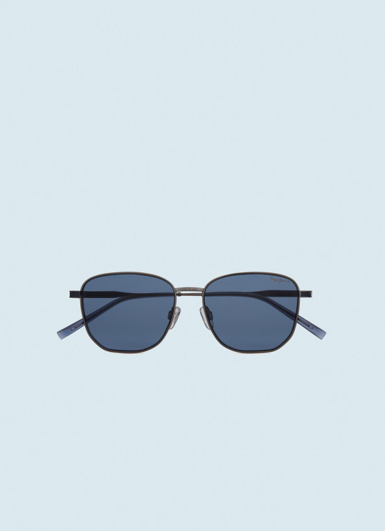 Geometrické šedé sluneční brýle značky Pepe Jeans. Brýle mají modrá sklíčka a zdobí je nápis Pepe Jeans.