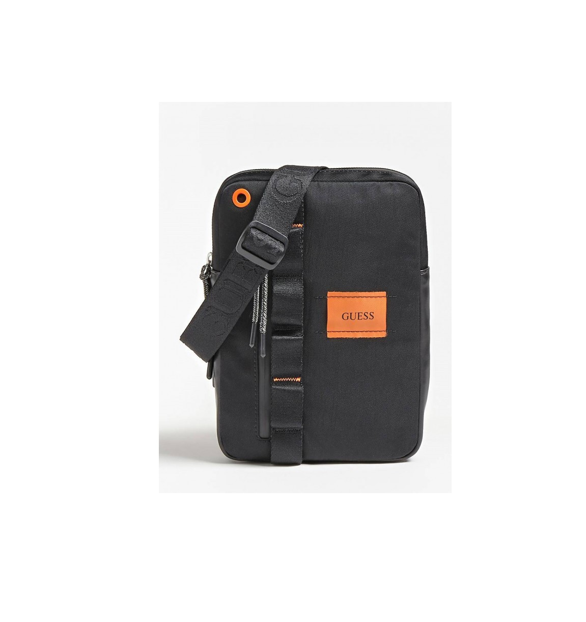 Sportovní černá crossbody brašna značky Guess. Brašna se uzavírá pomocí zipu. Má 1 libovolně nastavitelný ramenní popruh s nápisy Guess. Kabelka je zdobena oranžovými doplňky a nápisem Guess.