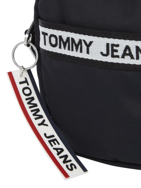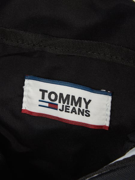 Pánská černá crossbody kabelka Tommy Jeans. Kabelka má libovolně nastavitelný černo-bílý popruh, který zdobí nápisy TOMMY JEANS. Kabelka má jednu velkou komoru.  Kabelku zdobí vpředu nápis TOMMY JEANS