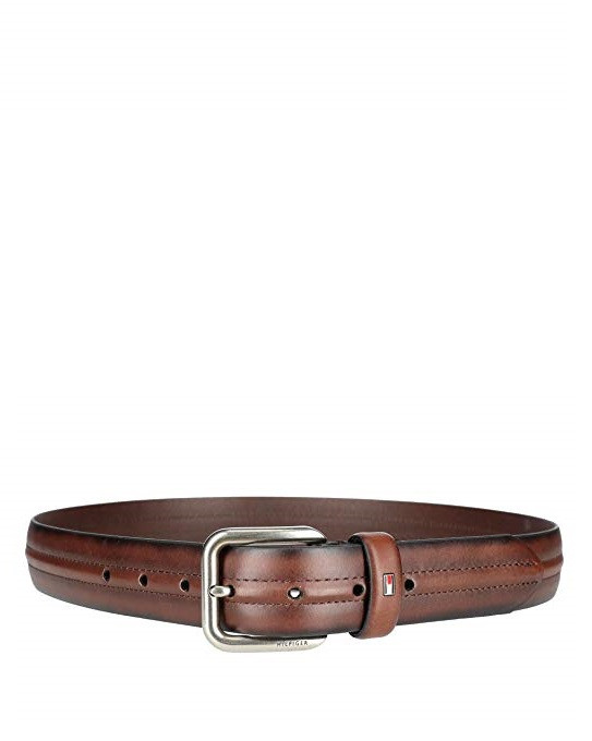 Elegantní pánský opasek TOMMY HILFIGER. Kožený opasek má tmavě hnědou barvu a zdobí ho prošívaný proužek uprostřed pásku po celé jeho délce. Opasek má stříbrnou sponu s logem.