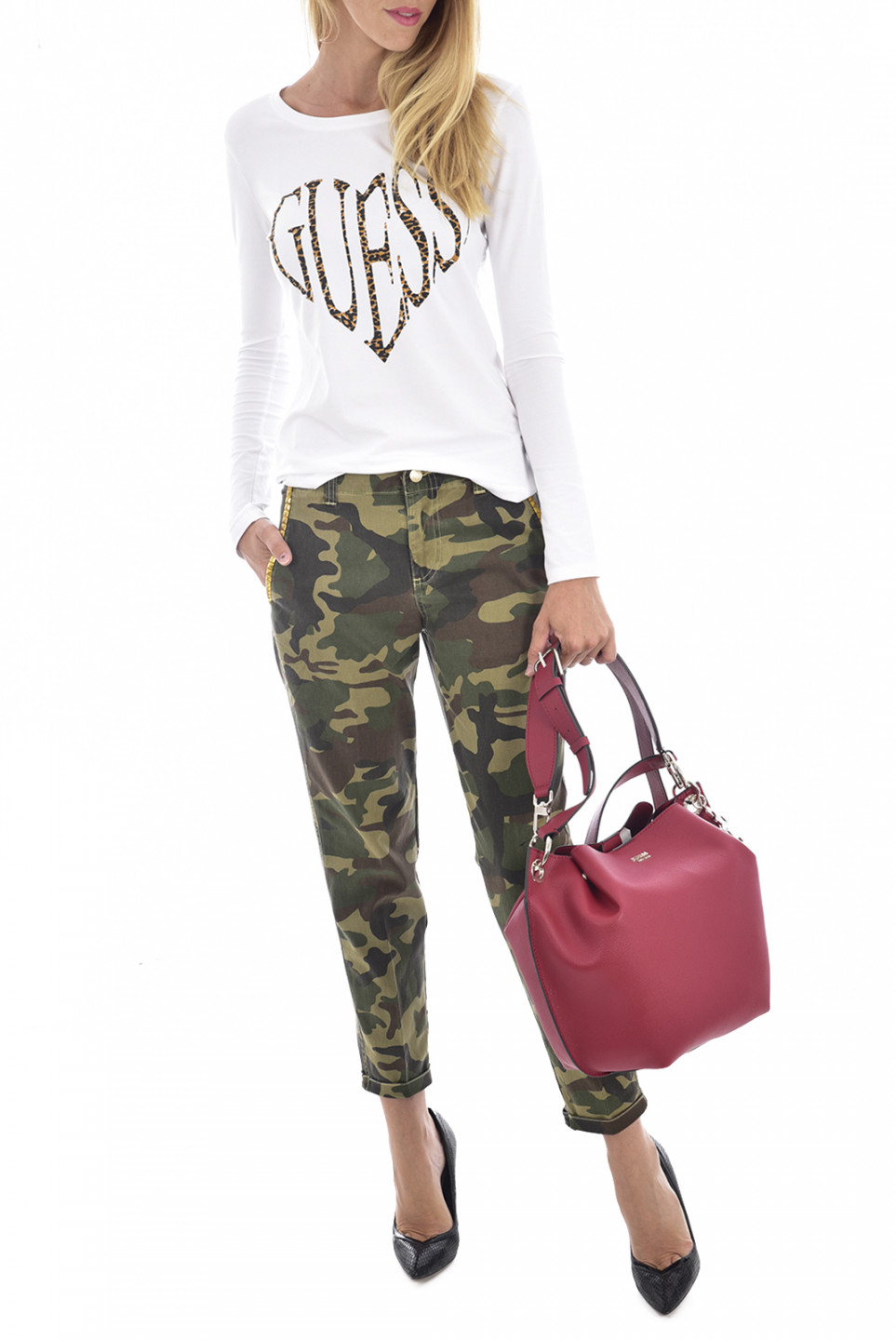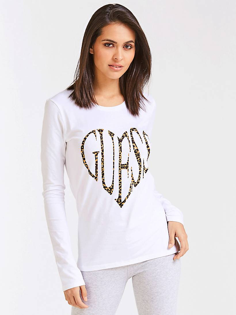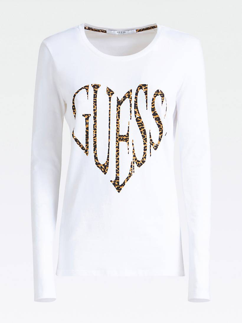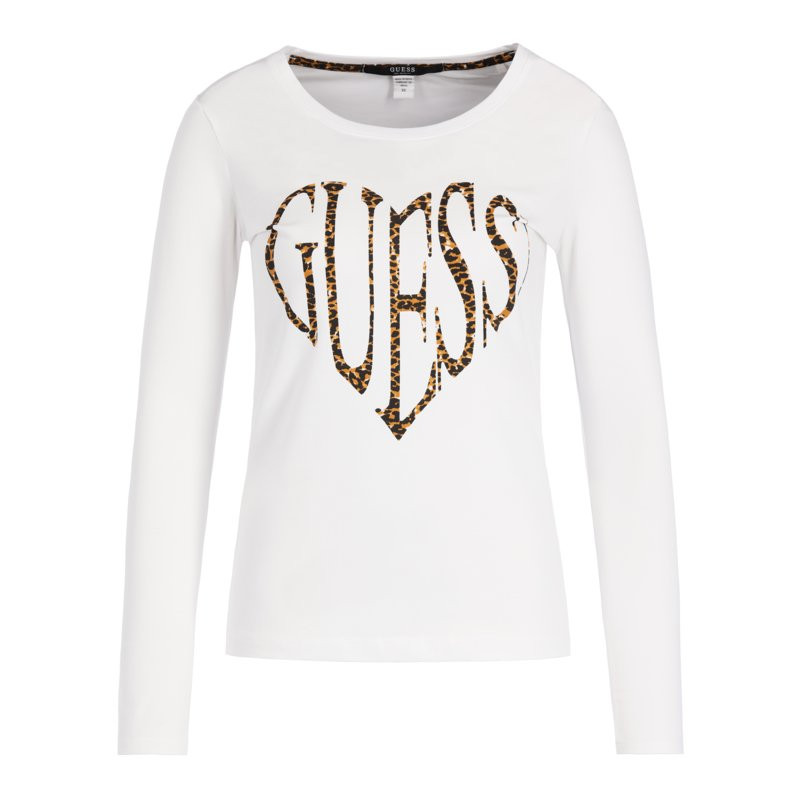 Dámské bílé tričko značky GUESS s dlouhým rukávem. Tričko zdobí na hrudi tygrovaný velký nápis GUESS. Volnější tričko se perfektně hodí do práce, do města i na párty.