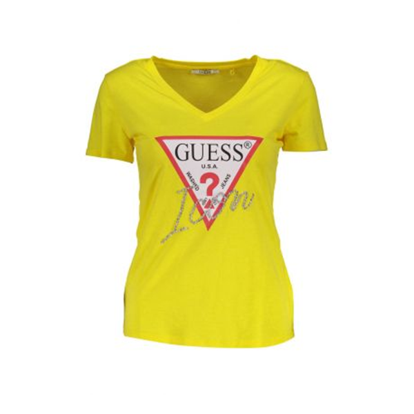 Dámské žluté tričko GUESS s krátkým rukávem. Módní tričko s výstřihem do V je zdobeno bílým trojúhelníkem a kamínky.