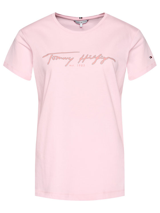Dámské růžové tričko značky Tommy Hilfiger. Tričko zdobí růžový nápis Tommy Hilfiger  a logo značky na rukávu.
