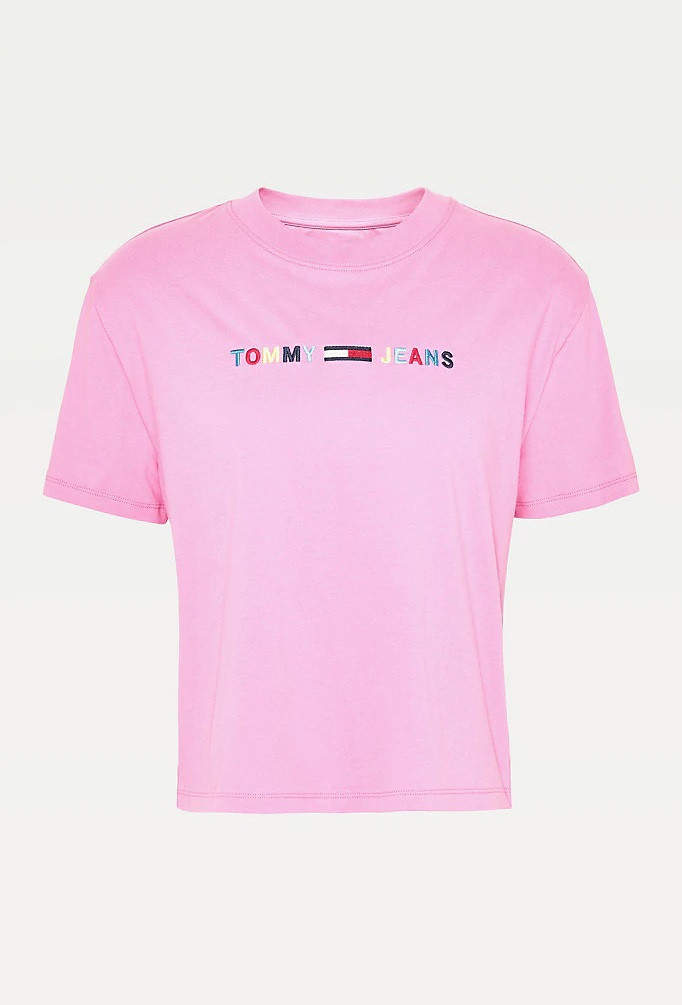 Dámské růžové tričko značky Tommy Jeans. Tričko zdobí na hrudi barevný nápis a logo TOMMY JEANS.
