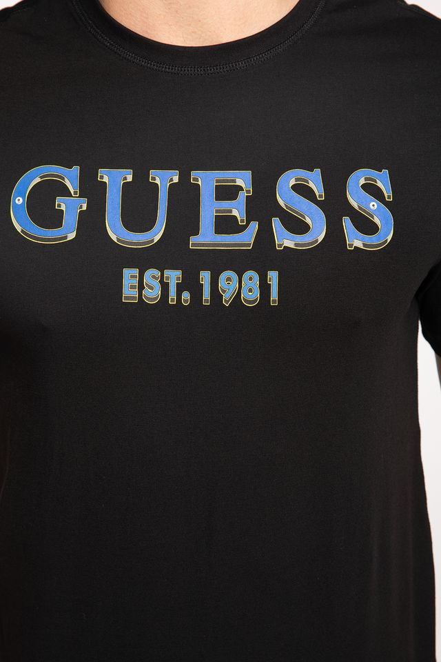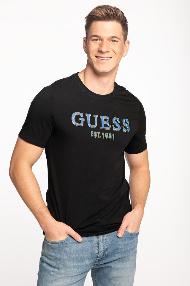 Pánské černé tričko značky GUESS. Tričko zdobí na hrudi nápis GUESS EST.1981.